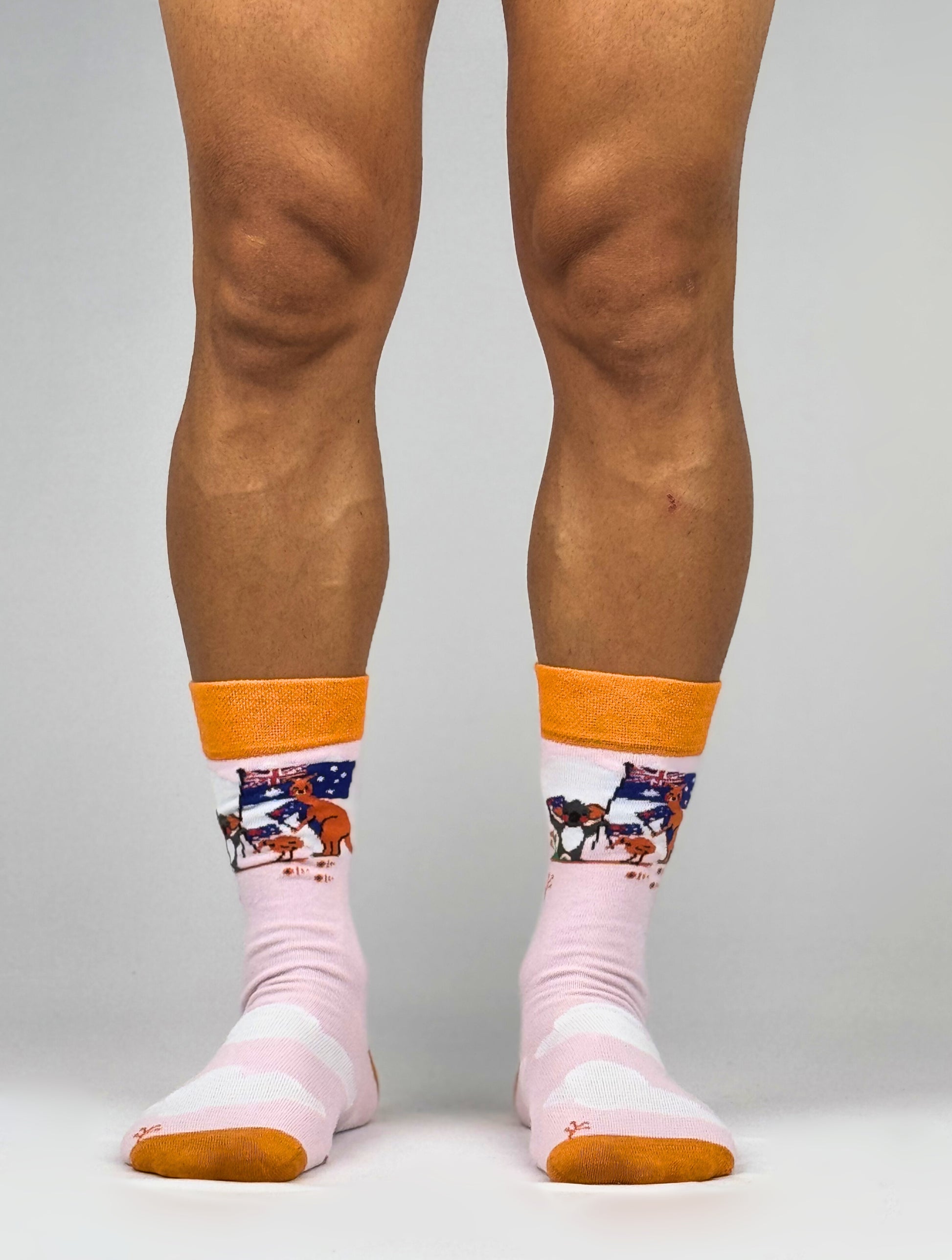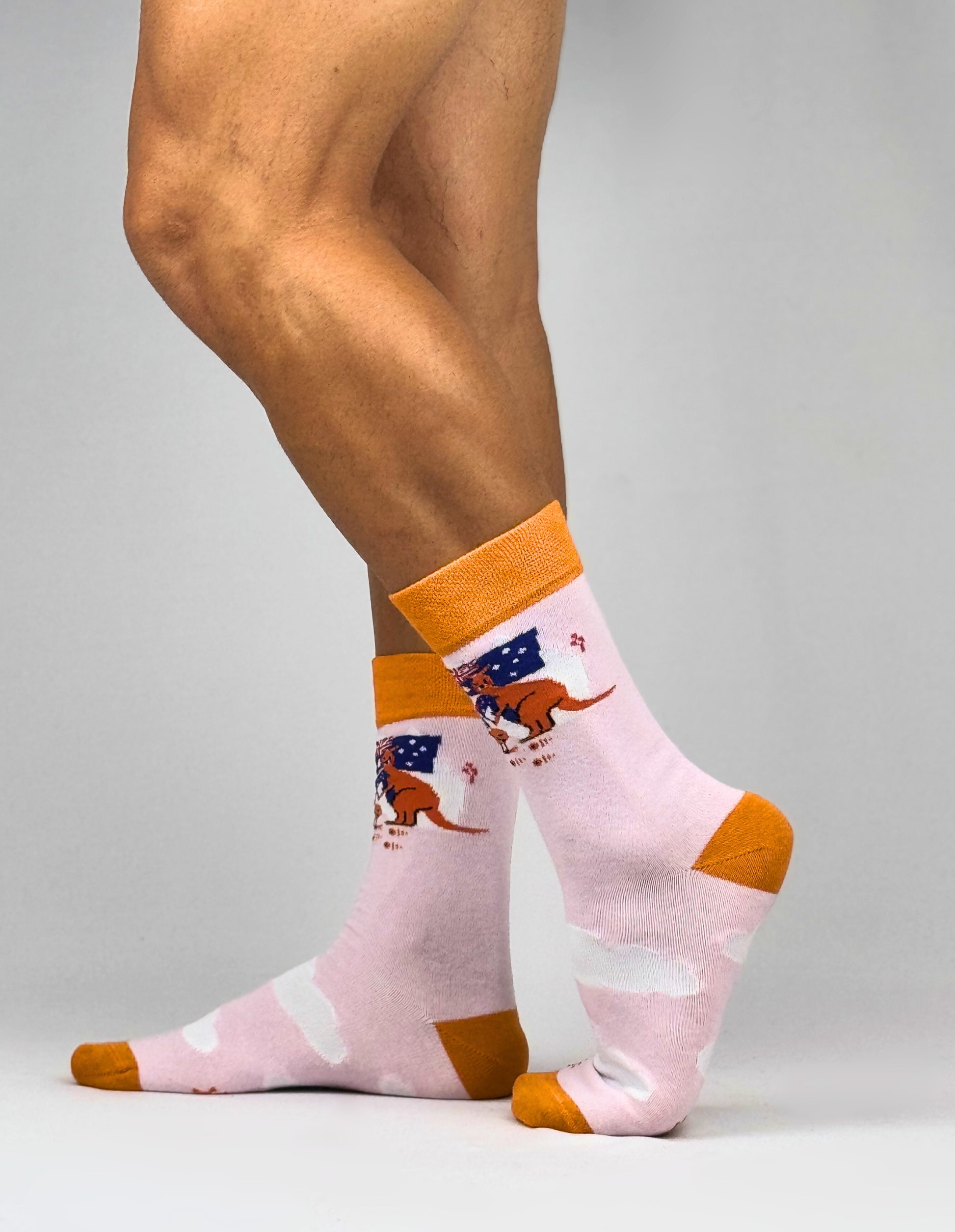 Meet the "Patriotic Pals" - a kangaroo and Australian white ibis duo proudly holding the Australian flag! These fun and festive socks are the perfect way to show off your Aussie spirit.